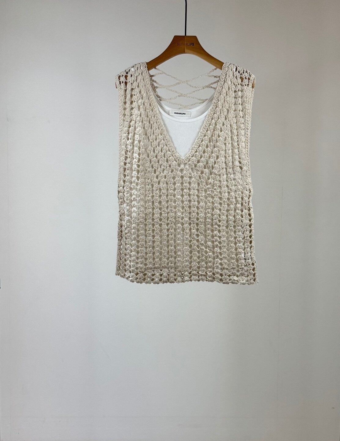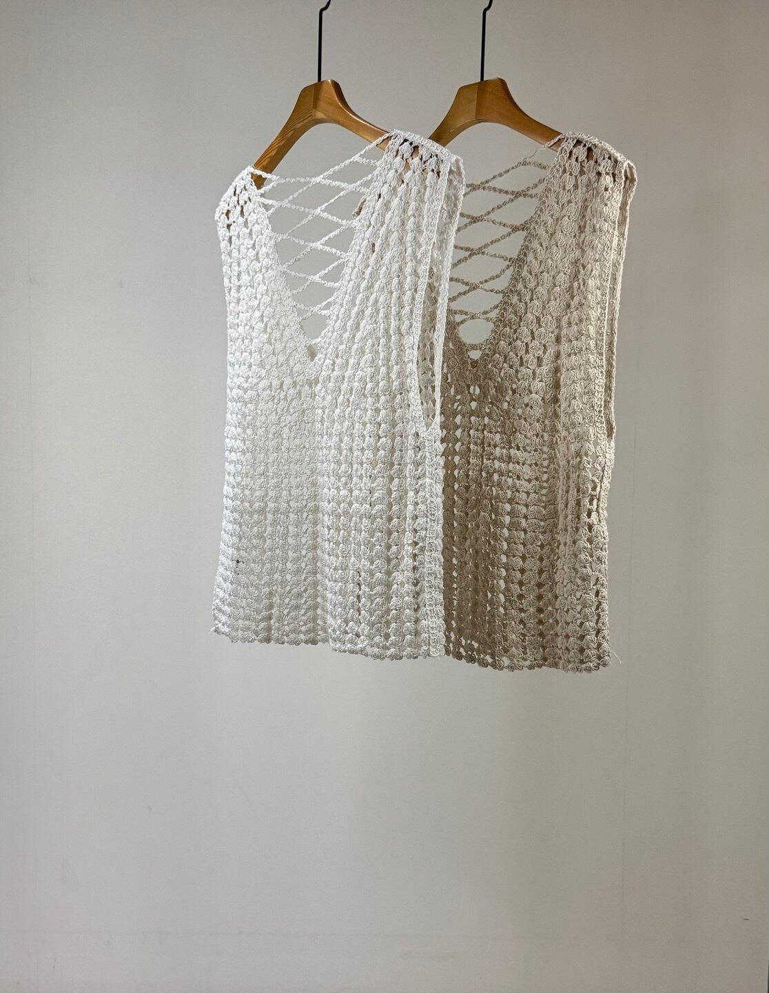 フラワーパターンのニット編みが引き立つクロシェベスト