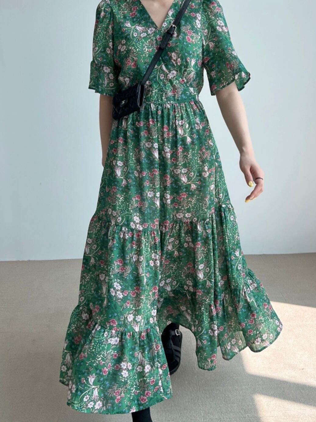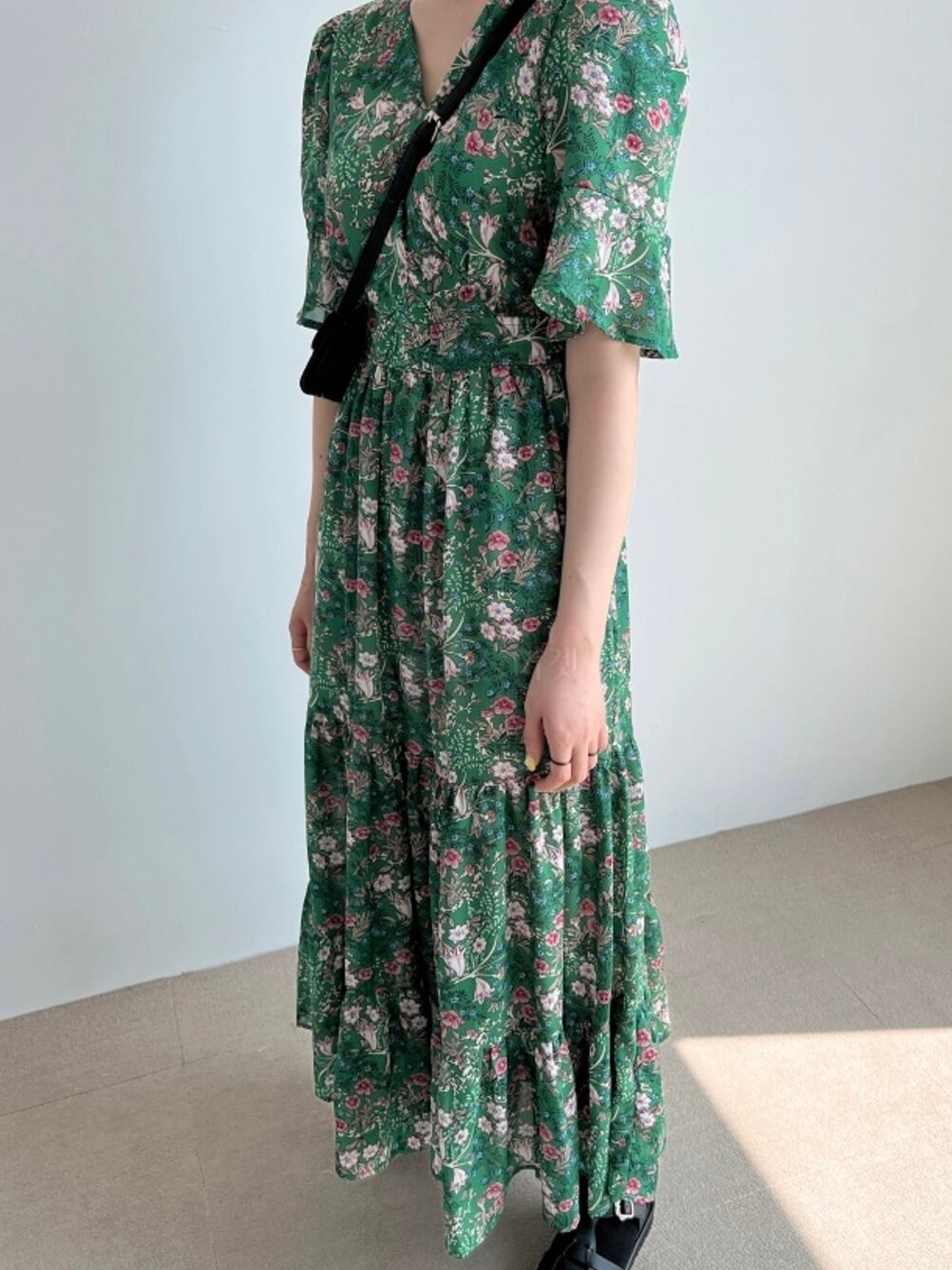 グリーン地にボタニカルフラワー柄が目をひくワンピース