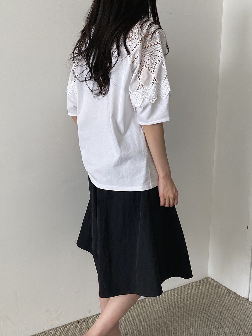 肩から袖にかけて、スカラップレースがデザイン